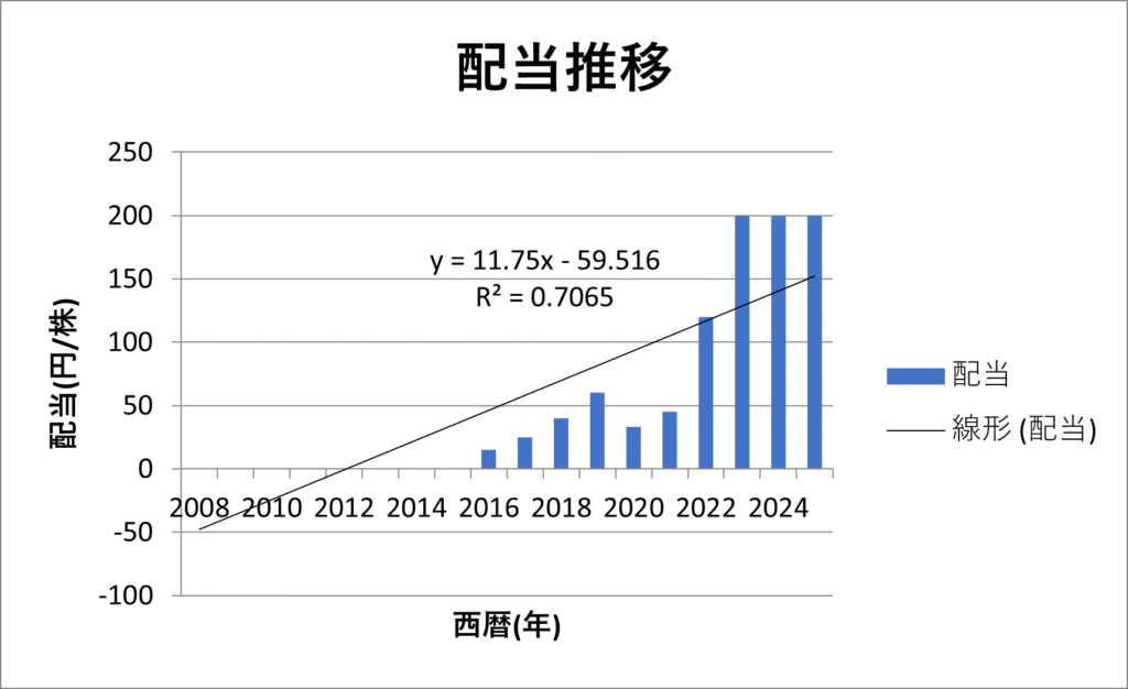 グラフを見ると、2013年まではマイナスのEPSではあったのですが、その後は全体的に見て右肩上がりに推移しているようには見えます。直近10年くらいは安定して増加しているように見えるので、今後の動向を注意深く見ていく必要がありそうです。