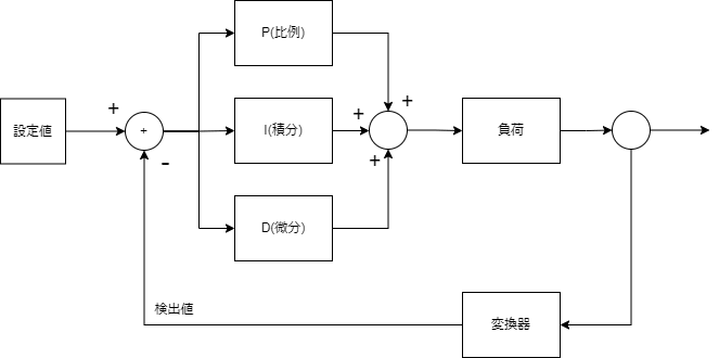 上記のブロック図は設定値と検出値の差を補償器を通して負荷に出力を行う系になります。検出値を取り込むことでフィードバック制御を行っております。