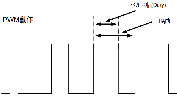 PWM出力とはPulse Width Modulation(パルス幅変調)出力の事であり、下記に示すようにパルス幅の大きさを変化させる事で出力を変更する出力方式になります。