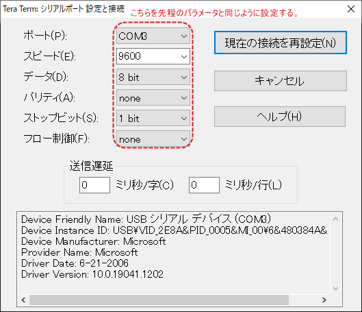 この画面上にビット/秒、データビット、パリティ、ストップビット、フロー制御の項目があります。通信を行う際には、送信側、受信側の上記パラメータを同じにする必要があります。
