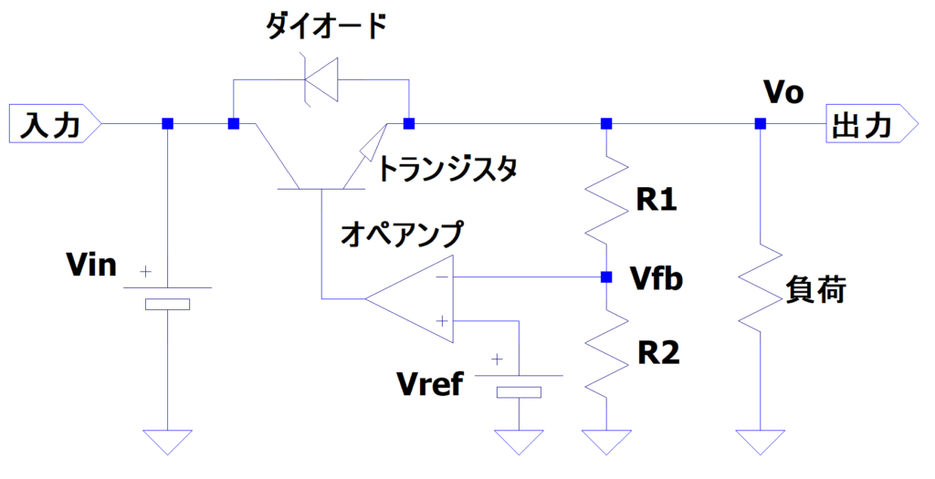 三端子レギュレータのシリーズレギュレータといったものの一種になり、シリーズレギュレータの基本的な回路ブロック図は下記の通りになります。